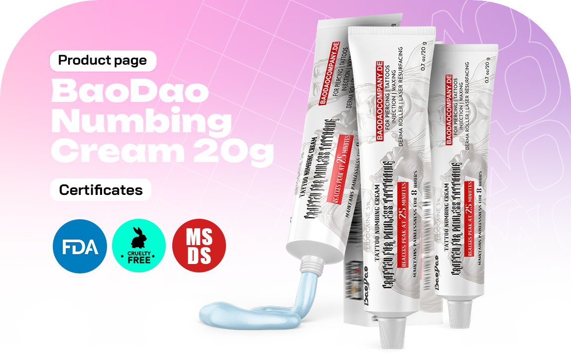 BaoDao Numbing Cream is an FDA-OTC approved tattoo numbing cream with 5% lidocaine, designed to provide unparalleled comfort by taking effect in just 25 minutes and offering peak relief for 4 to 8 hours. This superior cream surpasses all others in its category, ensuring a pain-free tattoo experience like no other.